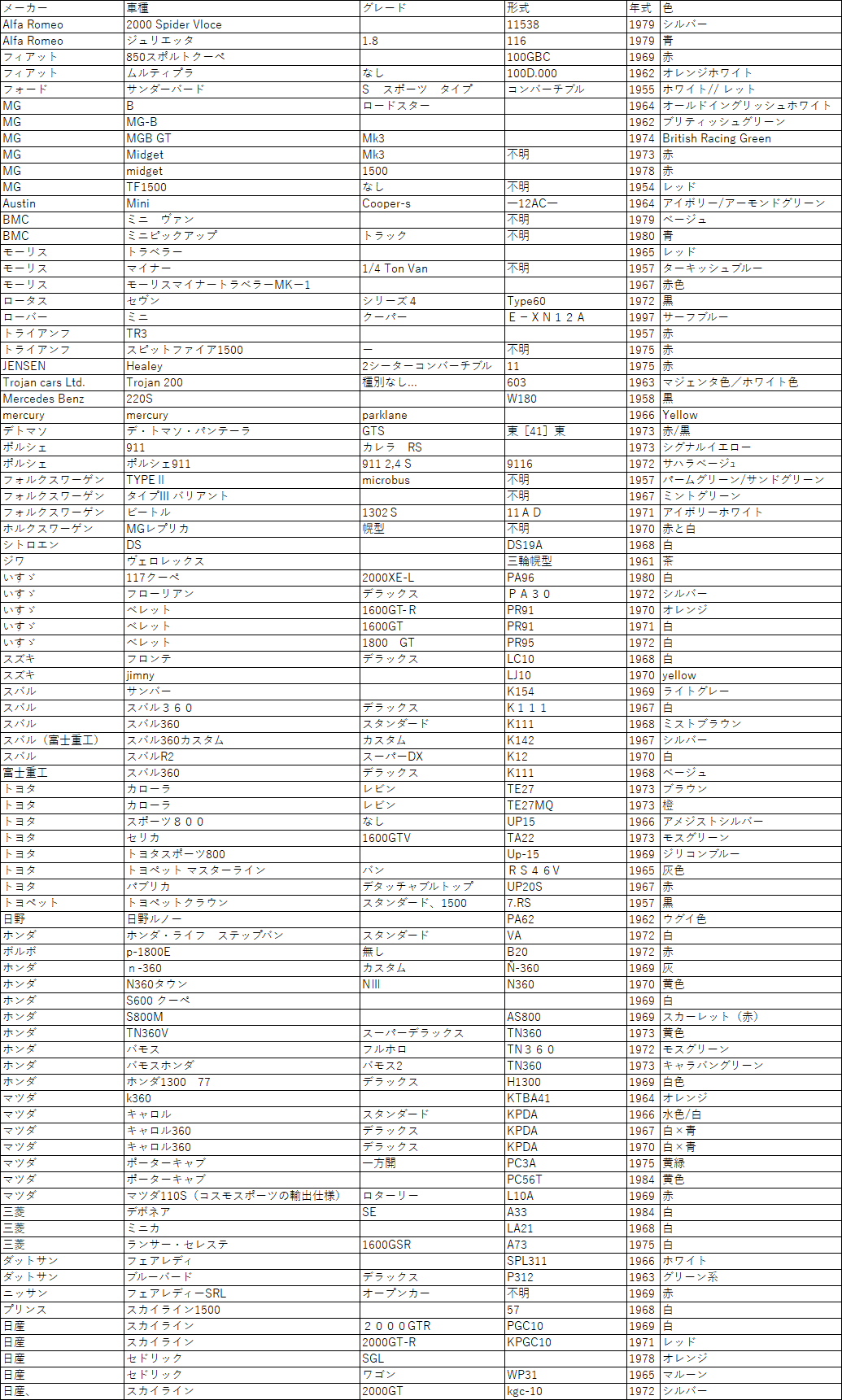 クラシックカーフェスタに参加をお願いした参加車両のリスト(自動車)を掲載します。